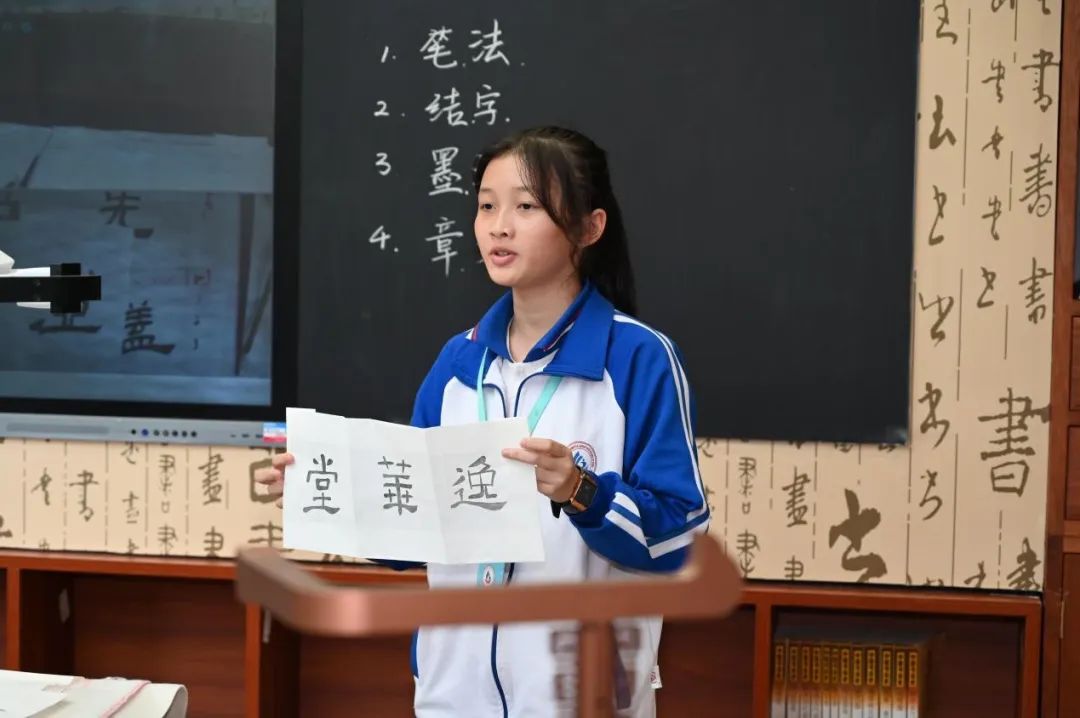 著名教育家沈尹默在《书法论丛》说:“世人公认中国书法是最高艺术,无色而具图画之灿烂,无声而有音乐之和谐,引人欣赏,心畅神怡”。华迈实验中学美术教师任艺铭结合民间习俗设计的《隶书之斋号匾额的创作》课程在华迈新建的特色书法教室开展,听课教师和学生一起共同体验隶书练习,任艺铭老师挥笔示范。