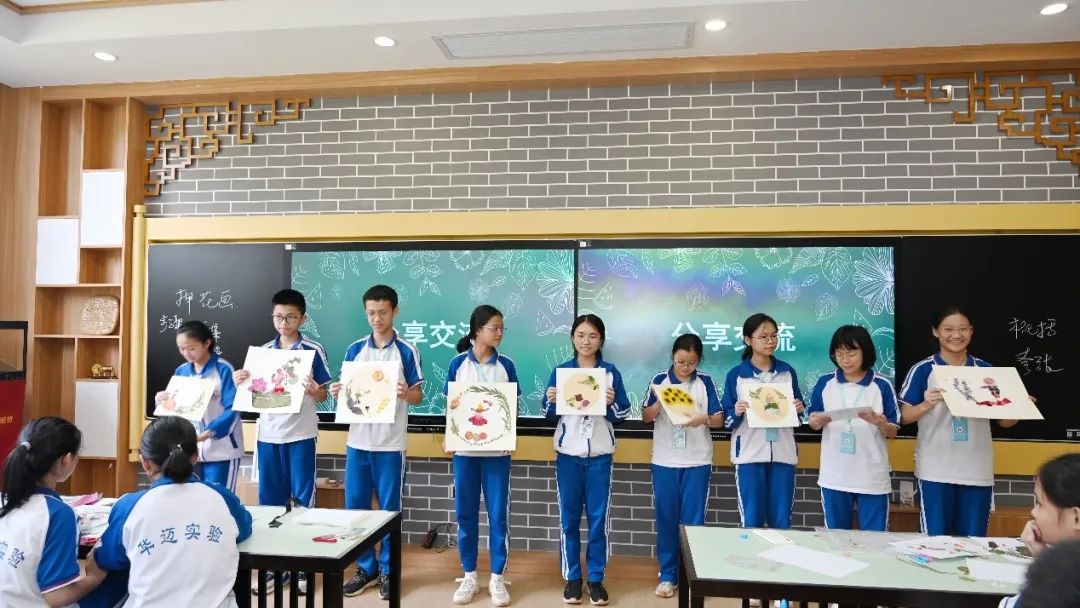 华迈实验中学美术老师王奕录的授课是《押花画》,该课程取材于校内外丰富的植物资源,尤其是教学楼天台的空中农场里百花园、百草园、百药园、百树园、百果园中花草植物。课前,老师先要带领学生采集、处理和压制植物,师生在感受自然之美和劳动的乐趣的同时,也亲手准备好了课程资源。